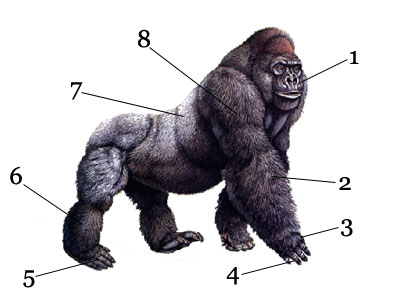 Email Drukuj Budowa ciała goryla Opublikowano w Zwierzęta Budowa ciała goryla - äußere Merkmale eines Gorillas _ 1- twarz (das Gesicht )2- ręka (die Hand)3- kciuk przeciwstawny (opponierbarer Daumen(der))4- palec chwytny (der Greiffinger)5- stopa (der Fuß ) 6- noga (das Bein)7- futro (die Behaarung)8- ramię (der Arm) « poprz. nast. »