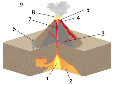 1. zbiornik magmy – die Magmakammer 2. magma – das Magma 3. wylot boczny – der Seitenschlot 4. lawa – der Lavastrom 5. krater – der Krater 6. fumarola – die Fumarole 7. wylot główny – der Hauptschlot 8. bomba wulkaniczna – vulkanische Bombe(die) 9. chmura popiołu – vulkanische Asche(die) |